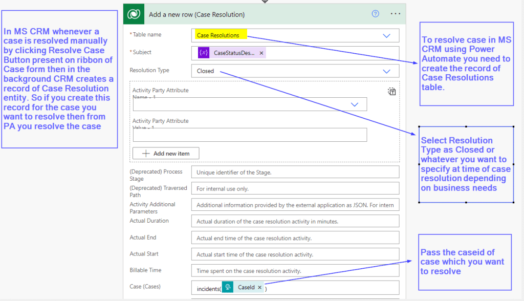 - To resolve case in MS CRM using Power Automate you need to create the record of Case Resolutions table.