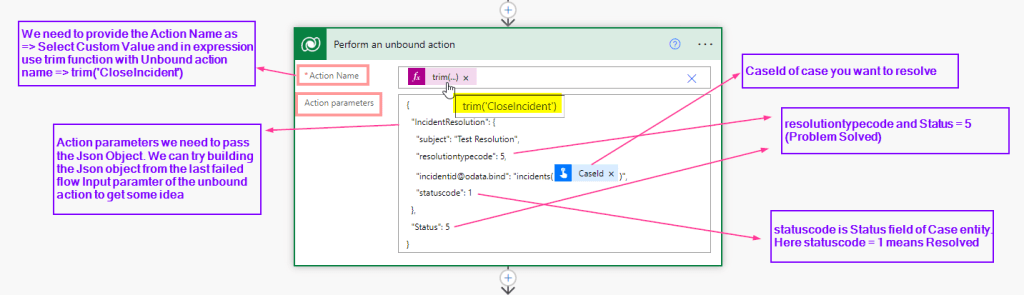 - We need to provide the Action Name as => Select Custom Value and in expression use trim function with Unbound action name => trim(‘CloseIncident’)
